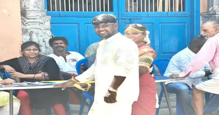 चेन्नई में एक नया शादीशुदा जोड़ा वोट डालने के लिए पोलिंग बूथ पर पहुंचा है। उनका वोटिंग में हिस्सा लेना एक्टिव सिटिजनशिप की भावना को मजबूत करने में हर वोट की अहमियत को दिखाता है।