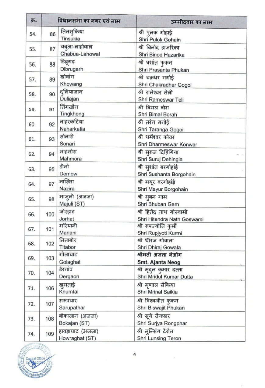 असम के मुख्यमंत्री हिमंत बिस्वा सरमा का भी नाम शामिल है, जिन्हें असम की जलुकबारी सीट से चुनाव मैदान में उतारा गया है। वहीं, हाल ही में कांग्रेस छोड़कर बीजेपी में शामिल होने वाले भूपेन कुमार बोरा बिहपुरा सीट से चुनाव लड़ेंगे।