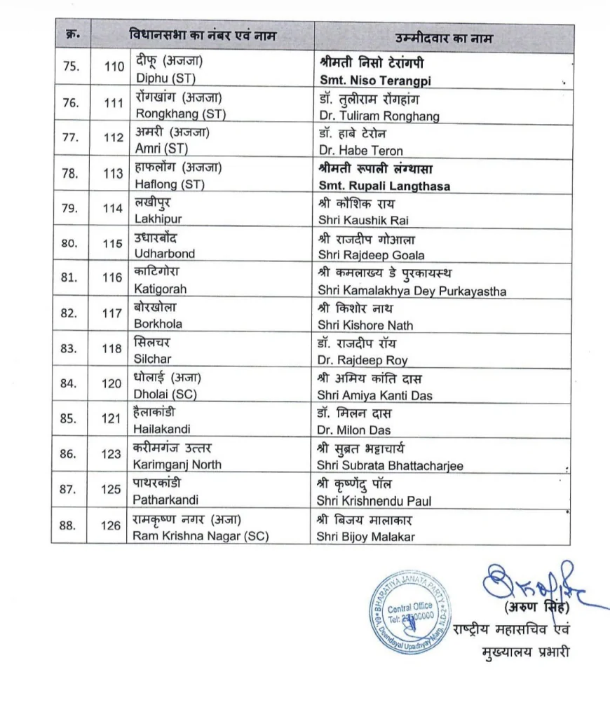 असम बीजेपी के एक्स हैंडल से उम्मीदवारों की लिस्ट जारी की गई है। इस सूची के अंत में अरुण सिंह (राष्ट्रीय महासचिव एवं मुख्यालय प्रभारी) का हस्ताक्षर भी है। लिस्ट जारी करते हुए लिखा गया कि आगामी विधानसभा चुनाव 2026 के लिए भारतीय जनता पार्टी द्वारा नामित उम्मीदवारों को हार्दिक बधाई और शुभकामनाएं।