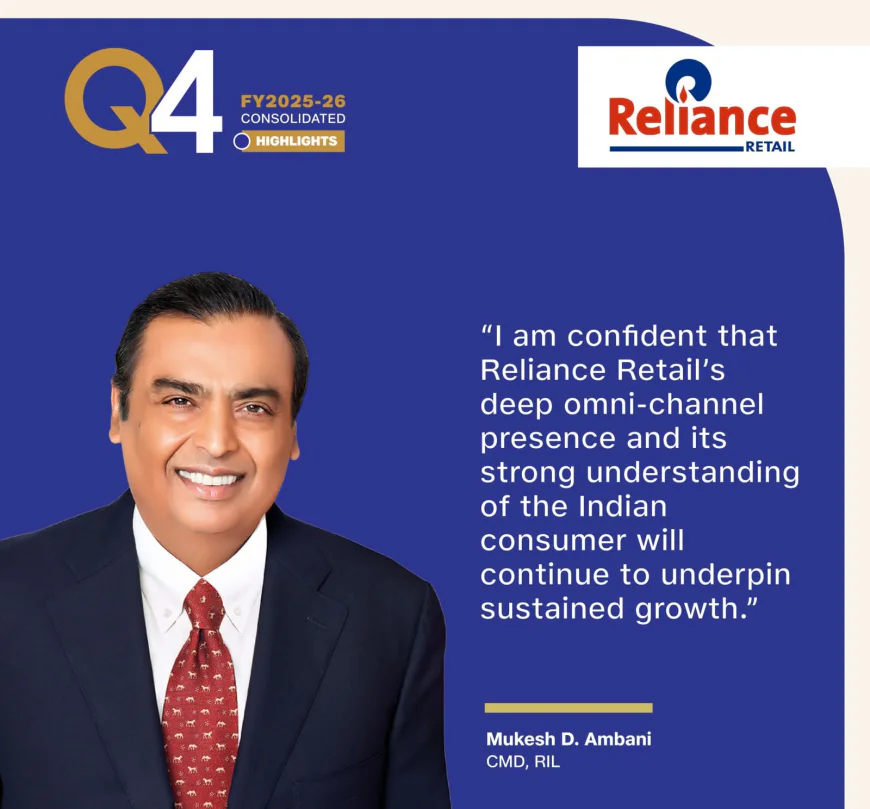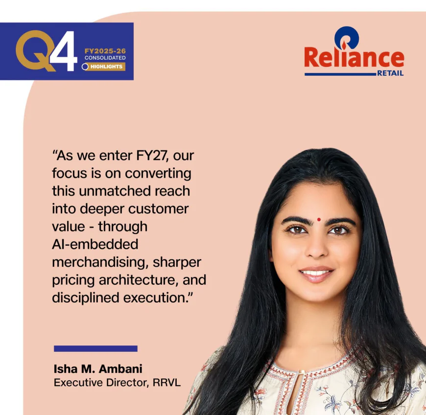 वहीं, रिलायंस रिटेल वेंचर्स लिमिटेड की एग्जीक्यूटिव डायरेक्टर ईशा एम. अंबानी ने कहा कि “FY26 रिलायंस रिटेल के लिए बड़े पैमाने पर ग्रोथ का साल रहा। हमारा रेवेन्यू ₹3.70 लाख करोड़ को पार कर गया, EBITDA ₹27,000 करोड़ से ऊपर पहुंचा और हमने 1.93 अरब ट्रांजैक्शंस के जरिए 38 करोड़ 70 लाख रजिस्टर्ड ग्राहकों को सेवाएं दी। यह भारत के सबसे बड़े रिटेल नेटवर्क की ताकत दिखाता है।