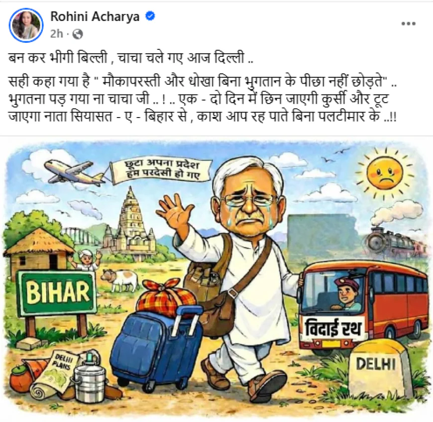इधर, नीतीश कुमार के दिल्ली जाने पर लालू यादव की बेटी रोहिणी आचार्या ने तंज कहा है। उन्होंने सोशल मीडिया प्लेटफॉर्म X पर लिखा, "बनकर भीगी बिल्ली...चाचा चले गये आज दिल्ली।' सही कहा गया है मौकापरस्ती और धोखा बिना भुगतान के पीछा नहीं छोड़ते। भुगतना पड़ गया ना चाचा जी। एक - दो दिन में छिन जाएगी कुर्सी और टूट जाएगा नाता सियासत-ए-बिहार से। काश आप रह पाते बिना पलटीमार के ..!!