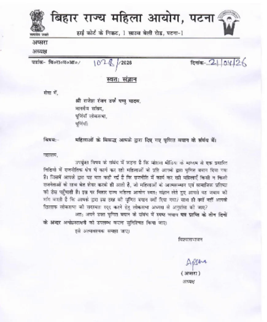 हाल ही में पप्पू यादव ने राजनीति में काम कर रही महिलाओं को लेकर आपत्तिजनक टिप्पणी की थी। बिहार राज्य महिला आयोग ने उनको उस वायरल वीडियो को लेकर नोटिस जारी किया है
